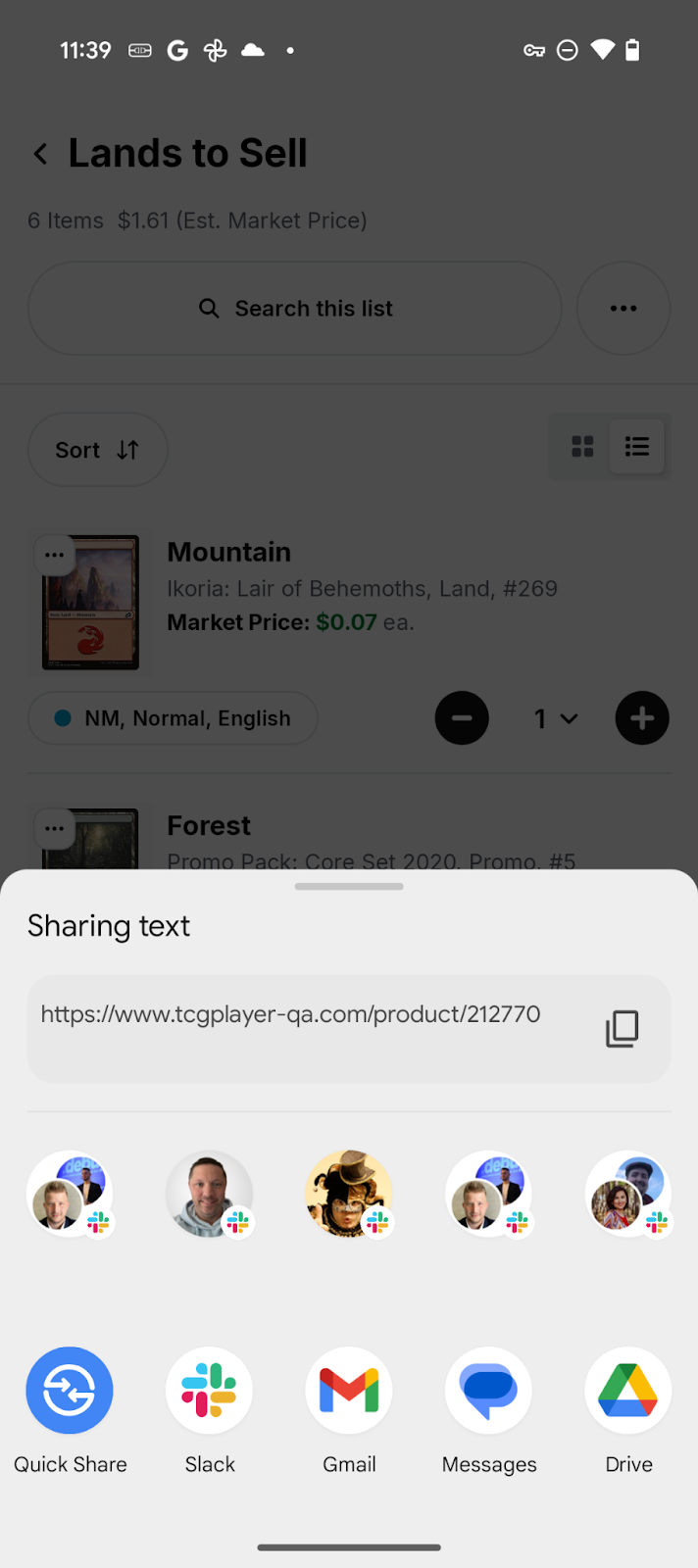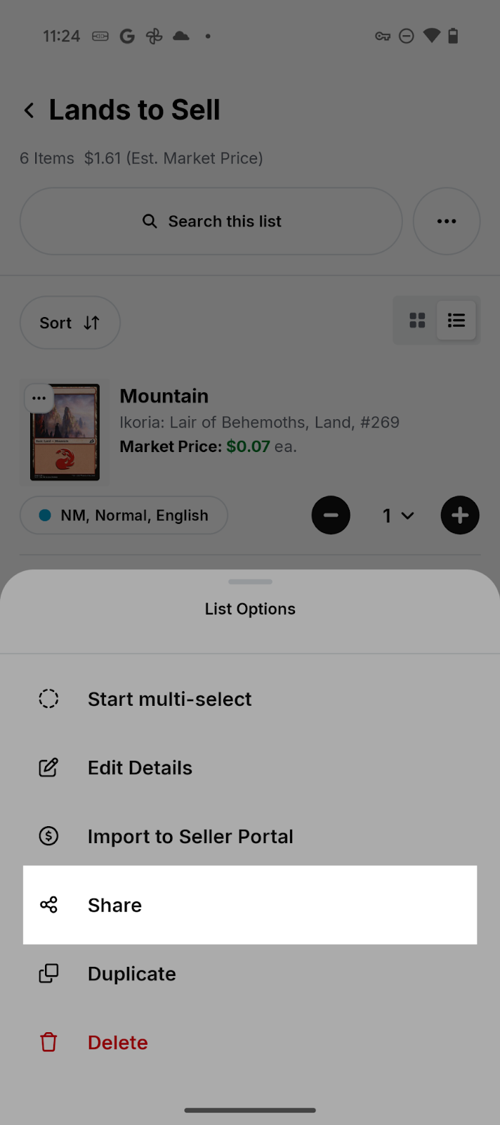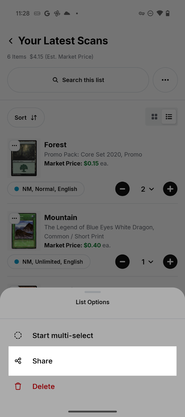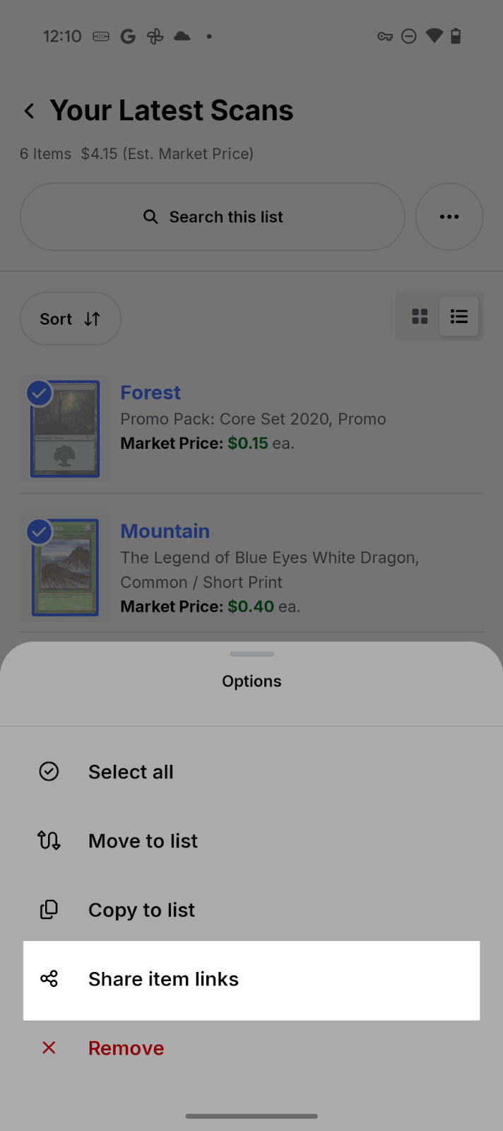 Sharing items and lists in the TCGplayer app is simple. There are three primary places you can share items and lists: the Scan tab, the Collection tab, and within a list.