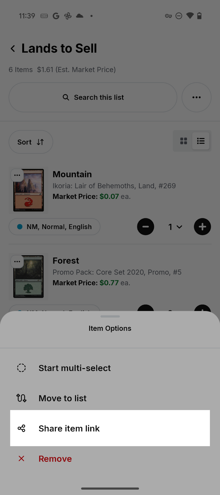 To share an item link, tap the ellipses on the card image, select “Share” from the list of options, and select where you’d like to share the item link.