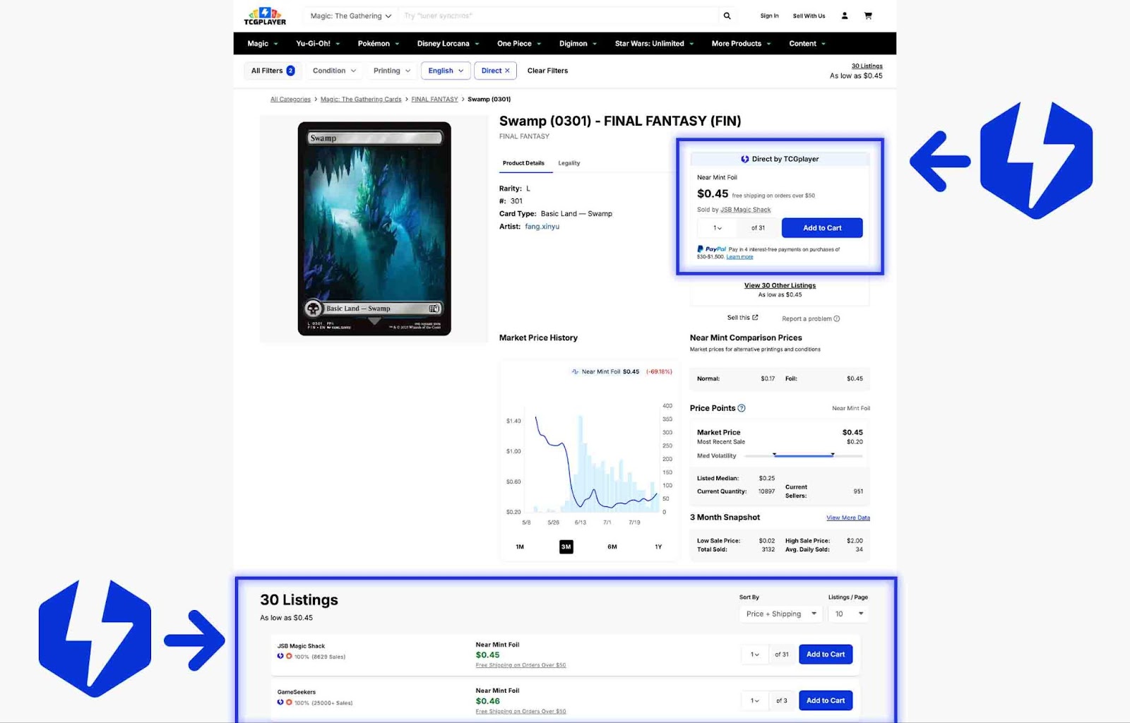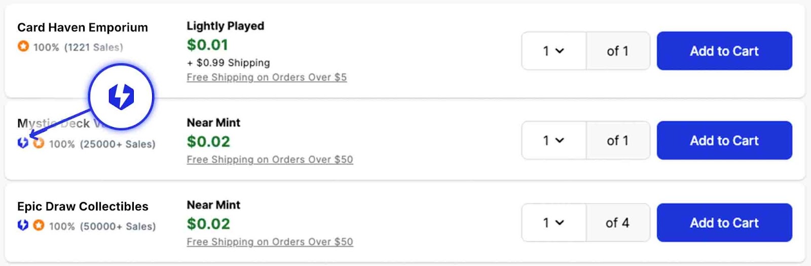 1. To order Magic: the Gathering, Yu-Gi-Oh!, or Pokémon singles from TCGplayer Direct, look for the “Direct Qualified Seller” icon on the product details page where you can view all the individual seller listings. Items from these Sellers will qualify for Direct as long as we currently have them available at our TCGplayer Direct Authentication Center.