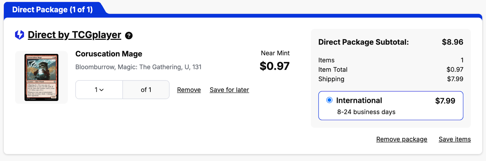 Any order that qualifies for TCGplayer Direct will appear in the Package #1 position of your cart. It will have a blue border and will have the TCGplayer Direct icon in the left corner of the package.