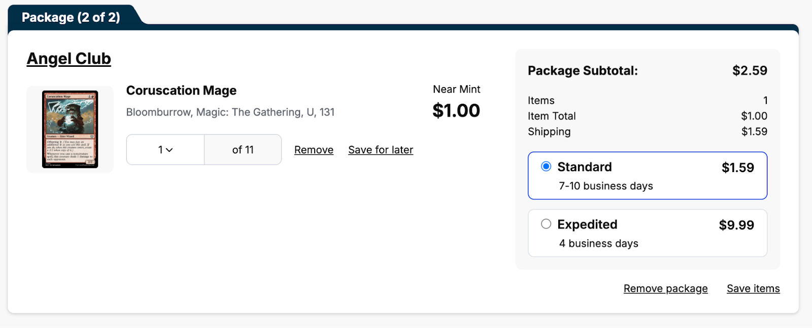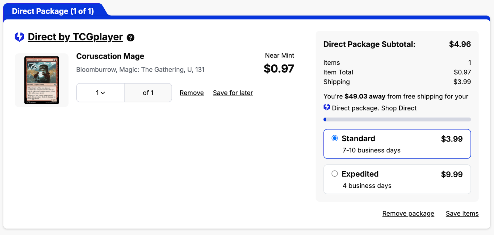 Any order that does not qualify for TCGplayer Direct will appear like Package #2 with a black border, and the name of the seller who will be delivering the package to you. Note that the available options for shipping (Standard vs Expedited) and the associated costs will vary from individual Seller to Seller.