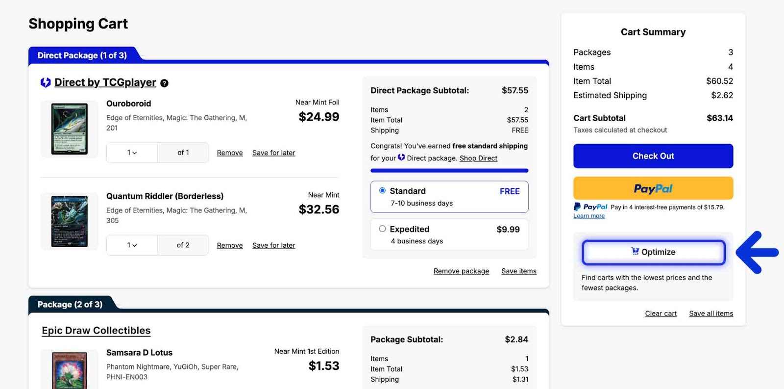 3. Once your cart contains all the items you want to buy, use the Cart Optimizer to create an even better Direct package. The Cart Optimizer will put all Direct qualified products into a single package for you. Just select the Direct by TCGplayer cart.