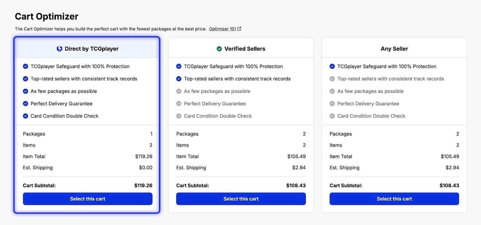 Items carried by TCGplayer Direct are clearly marked with the TCGplayer Direct icon . Our Cart Optimizer can help you search for cards that are supported by this program.
