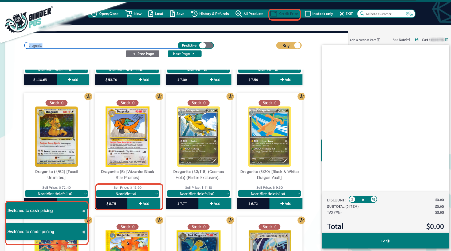 In the above image, the pricing has been switched from Cash to Credit. The highlighted Dragonite card's pricing has been updated to account for the credit option. Remember: credit will always be higher than cash. Please also note the warning at the bottom left of the page alerting when the pricing is changed between Cash and Credit.