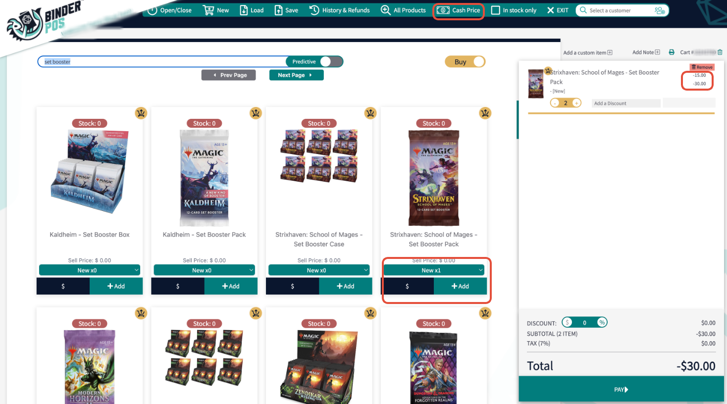 While the Buy toggle is a great tool for adding items that are already in your system, whether you have them in stock or not, such as TCG Singles, if not careful, the Credit and Cash price options can prove frustrating. See below for an example: