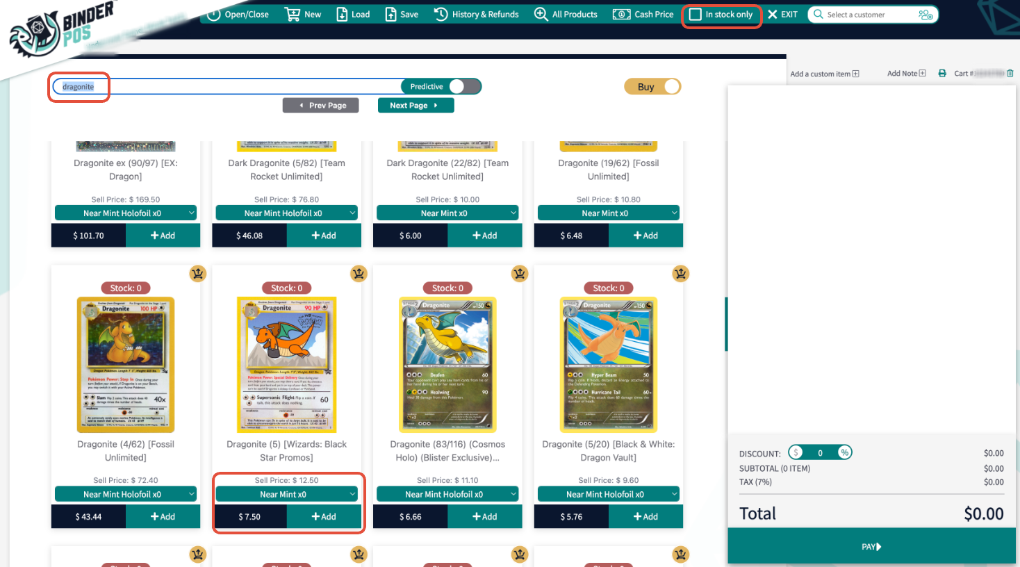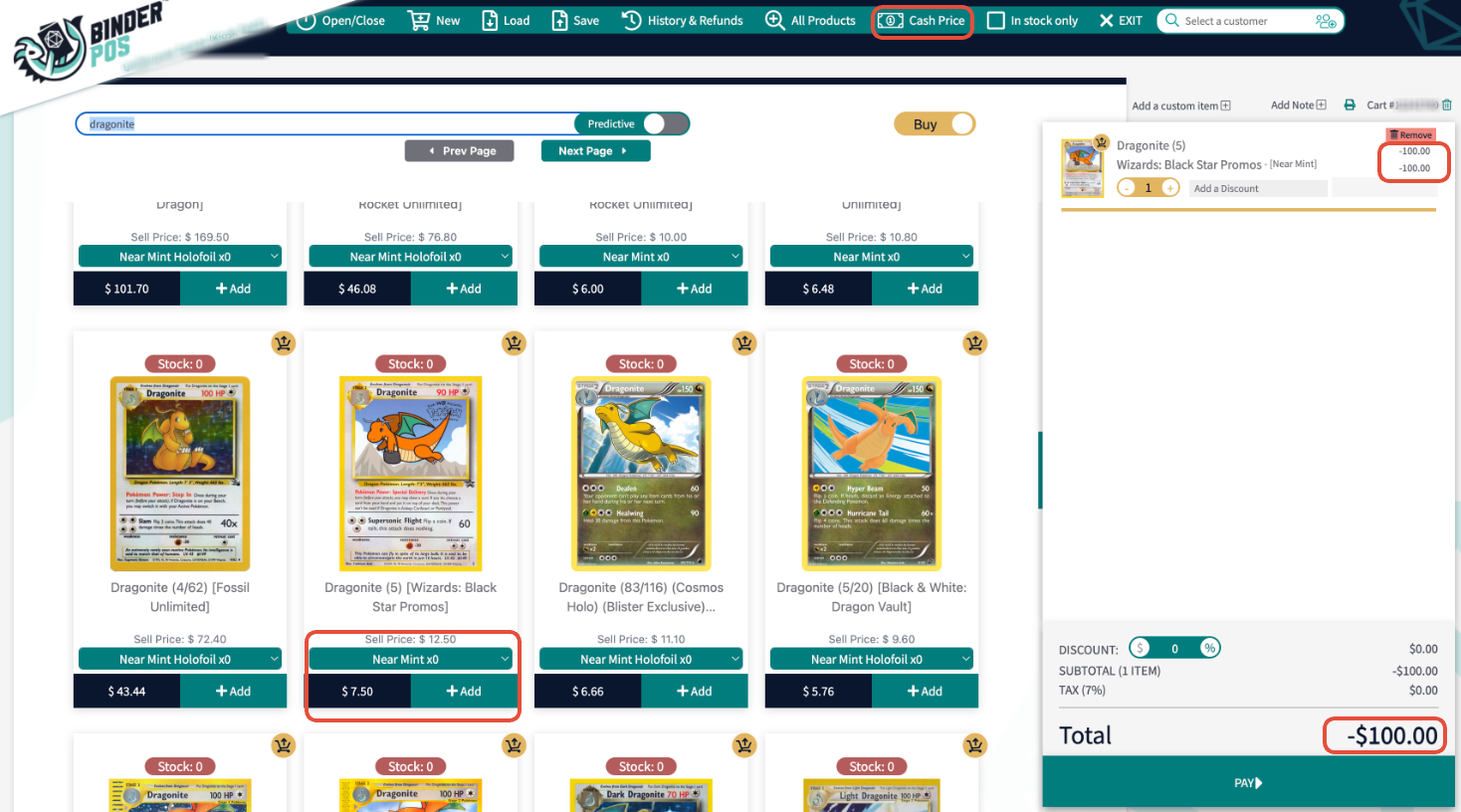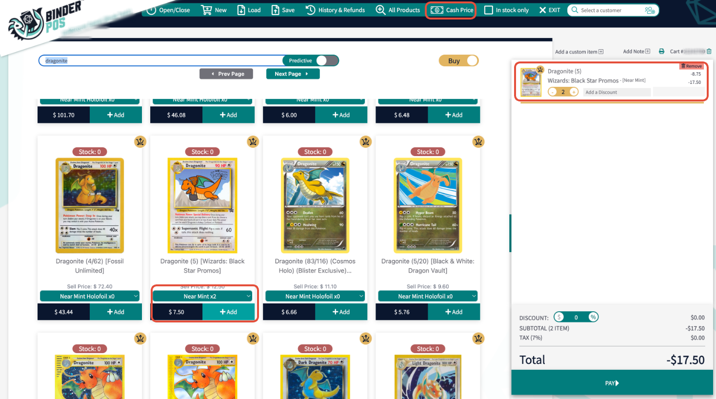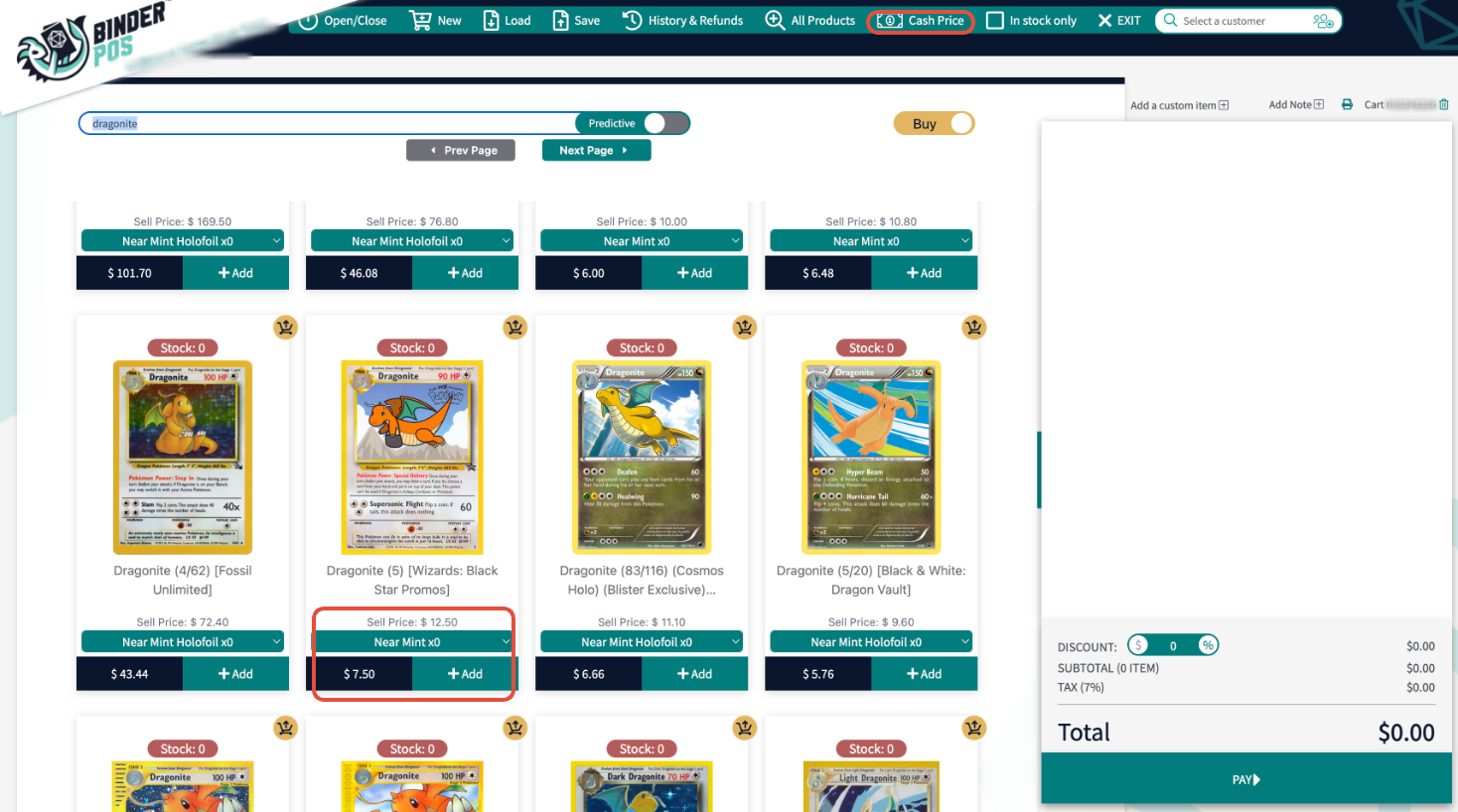 In the above image, the Buy is set to Cash Prices. Notice that, even though there are none of the selected Dragonite cards in stock, there is still a cash price available.