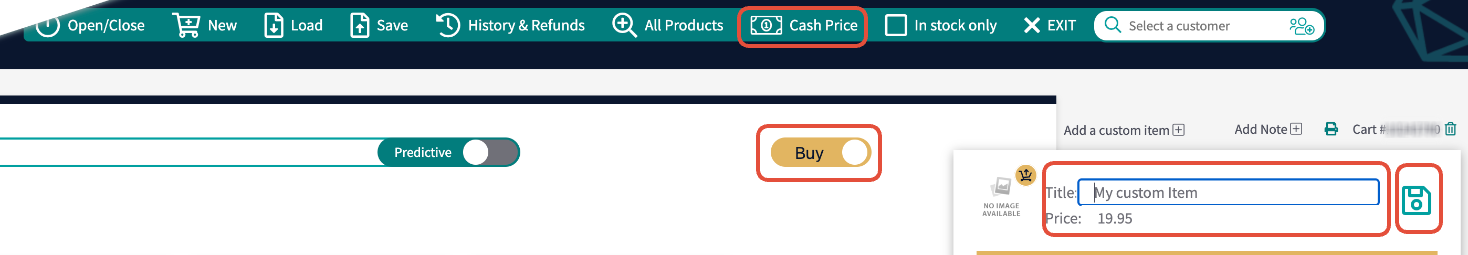 Once Add a Custom Item has been selected, input all of the custom product info and select the save symbol to add the custom product. These custom products will not be affected by the Credit or Cash pricing. HOWEVER, if a custom item is added to a cart with other products and a Cash/Credit Pricing occurs, the entire cart may have to be abandoned and restarted. Please still be aware of the Cash/Credit toggle to avoid annoyances and frustrations.