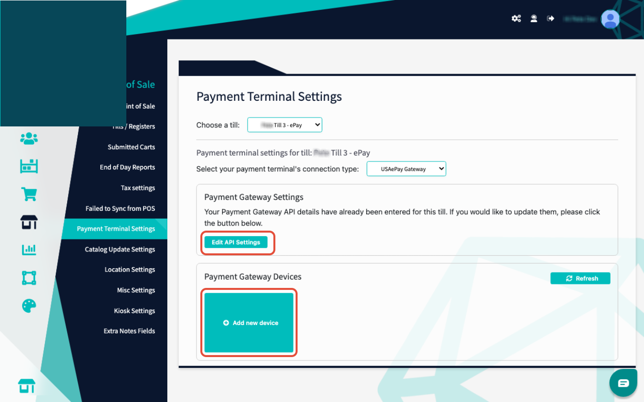 After selecting the till and the USAePay Gateway connection type, input the accompanying API Key and API Pin